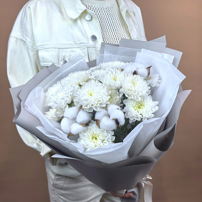 Букет из хризантем, хлопка и гипсофилы