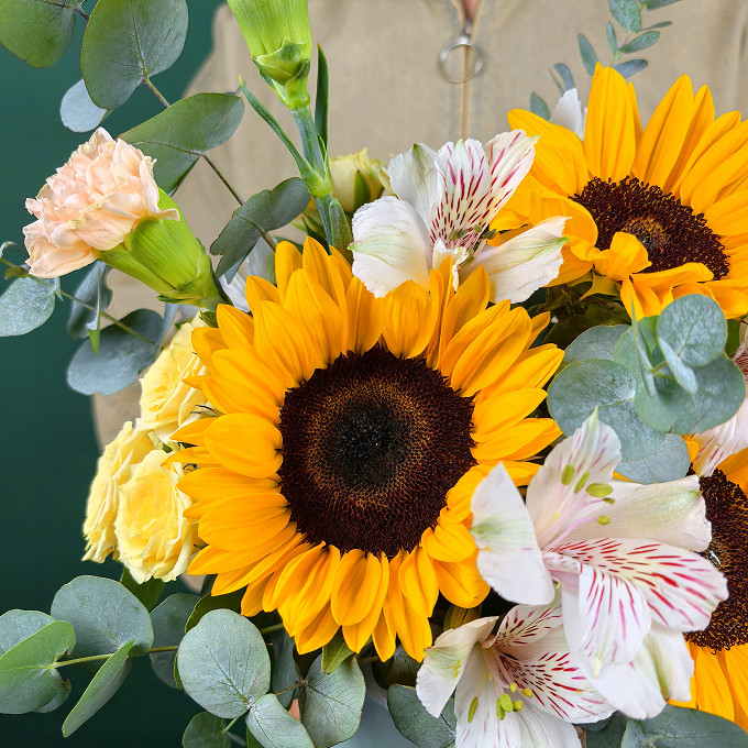 Альстромерия, Гвоздика, Подсолнух, Роза кустовая, Шляпная коробка, Эвкалипт