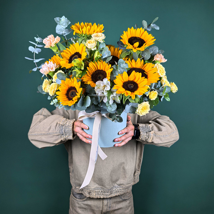 Альстромерия, Высота букета: 40см, Гвоздика, Подсолнух, Шляпная коробка, Эвкалипт